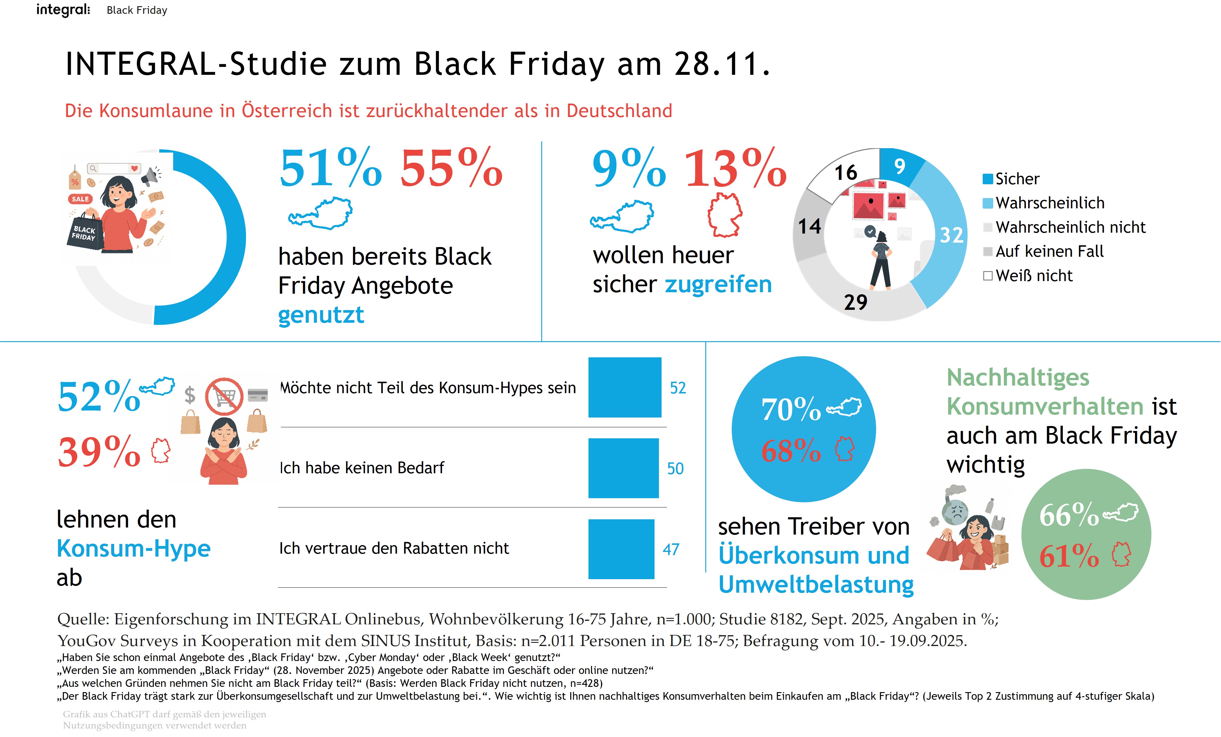 Trotz hoher Bekanntheit des Black Friday liegen die Einstellungen in Österreich und Deutschland spürbar auseinander. Während Deutschland den jährlichen Aktionstag besser bewertet und stärker nutzt, reagiert Österreich deutlich zurückhaltender. Die neuesten Vergleichsdaten von INTEGRAL für Österreich und SINUS in Kooperation mit YouGov für Deutschland zeigen: Deutsche planen häufiger einen Einkauf, bewerten Rabatttage positiver und stehen Preisaktionen mit weniger Misstrauen gegenüber. In Österreich hingegen dominieren Skepsis und der Wunsch nach bewussterem Einkaufen.