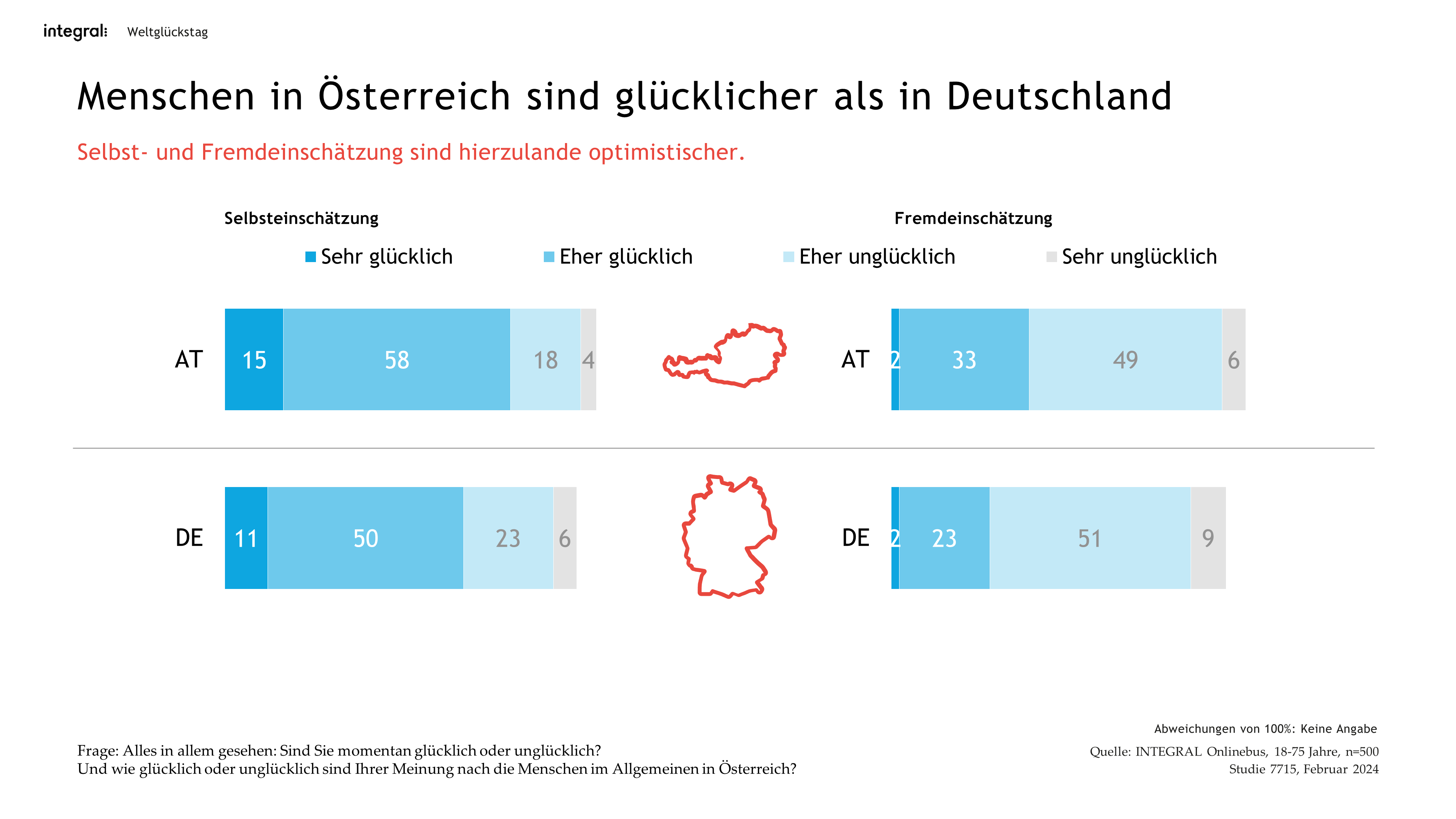 Martin Mayr, Mitglied der Geschäftsleitung von INTEGRAL, analysiert die zurückhaltende Wahrnehmung zur Befindlichkeit der Mitmenschen: „Ein Grund könnte darin liegen, dass die intensive Berichterstattung zu Krisen und negativen Entwicklungen in vielen Menschen den Eindruck erweckt, dass es einem Großteil der Bevölkerung immer schlechter geht. Wenn man also der Meinung ist, selbst ein glückliches Leben zu führen, geht man davon aus, dass dies vielen anderen nicht möglich ist.“