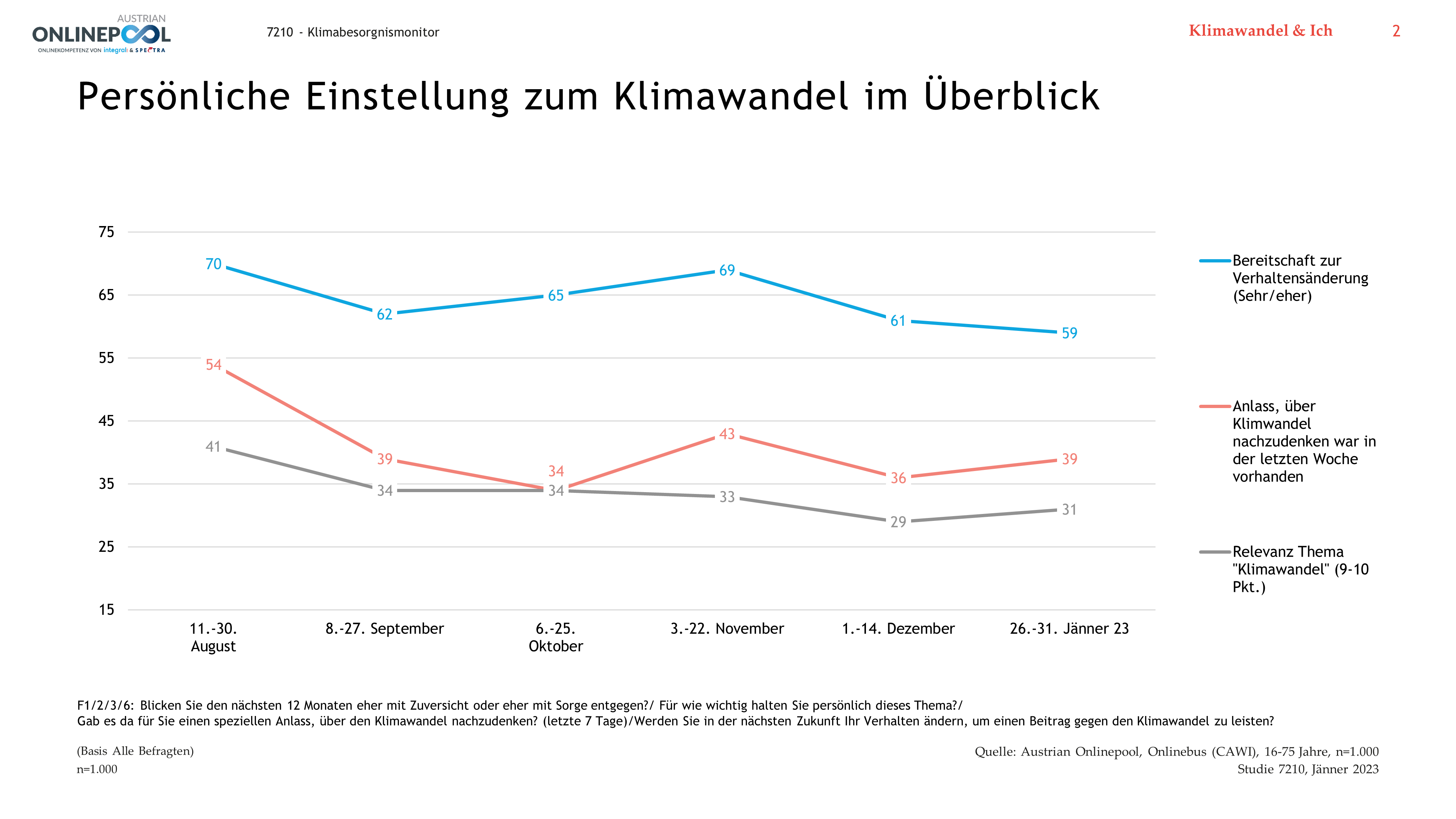 Die Präsenz der Klimaproblematik ist auch mit der Bereitschaft zur Verhaltensänderung verbunden. Im letzten August gaben noch 70% an, sich in Zukunft klimafreundlicher verhalten zu wollen. Aktuell sind es nur mehr 59%.