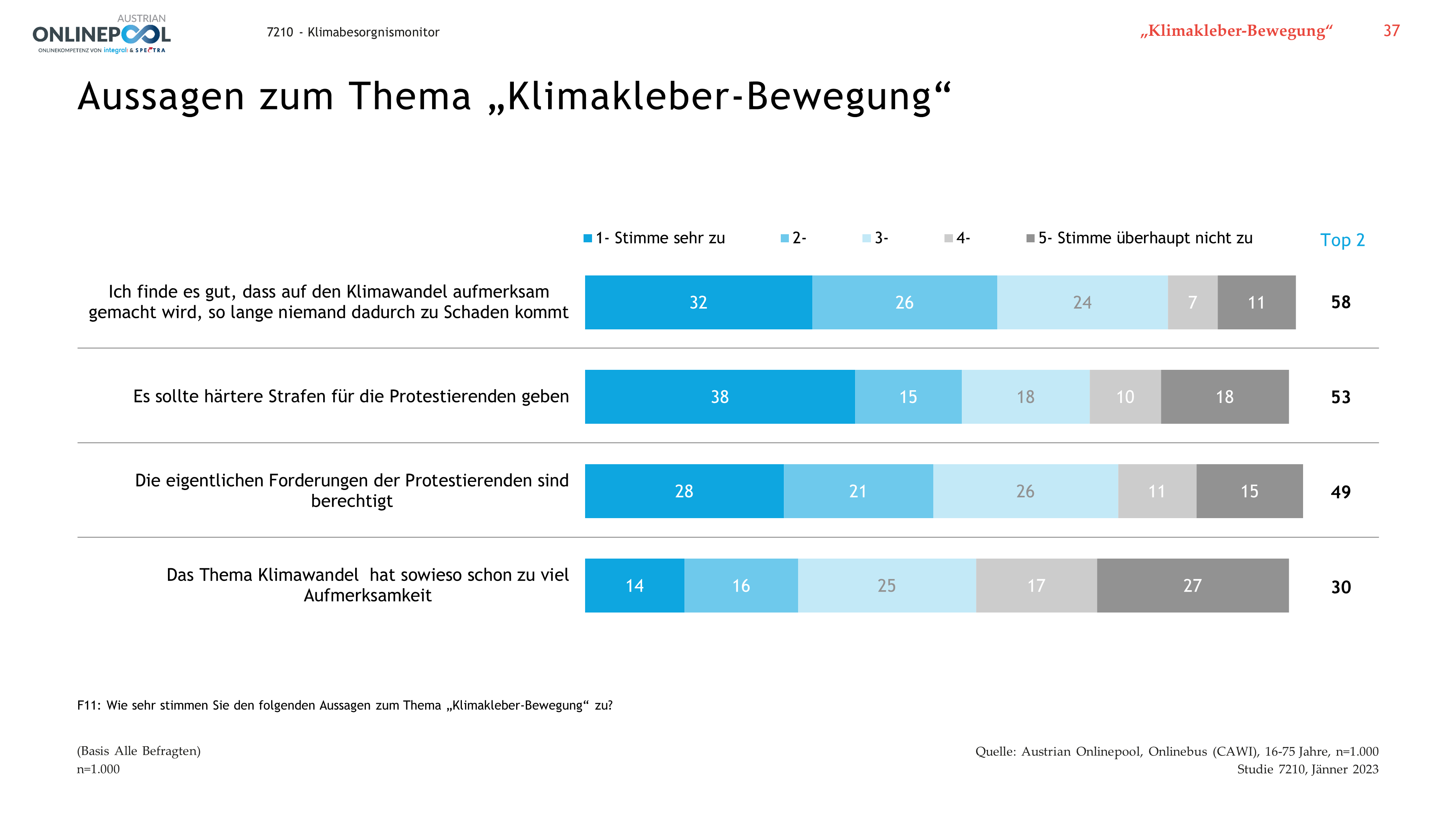 Bei aller Skepsis hinsichtlich der Effektivität stimmen knapp 6 von 10 Befragten der Aussage zu, es sei gut, auf den Klimawandel aufmerksam zu machen, solange niemand dadurch Schaden nimmt. Formal Höhergebildete und Personen in Wien sind noch stärker dieser Ansicht. Auch ist die Hälfte der Befragten der Meinung, die eigentlichen Forderungen der Protestierenden seien berechtigt.