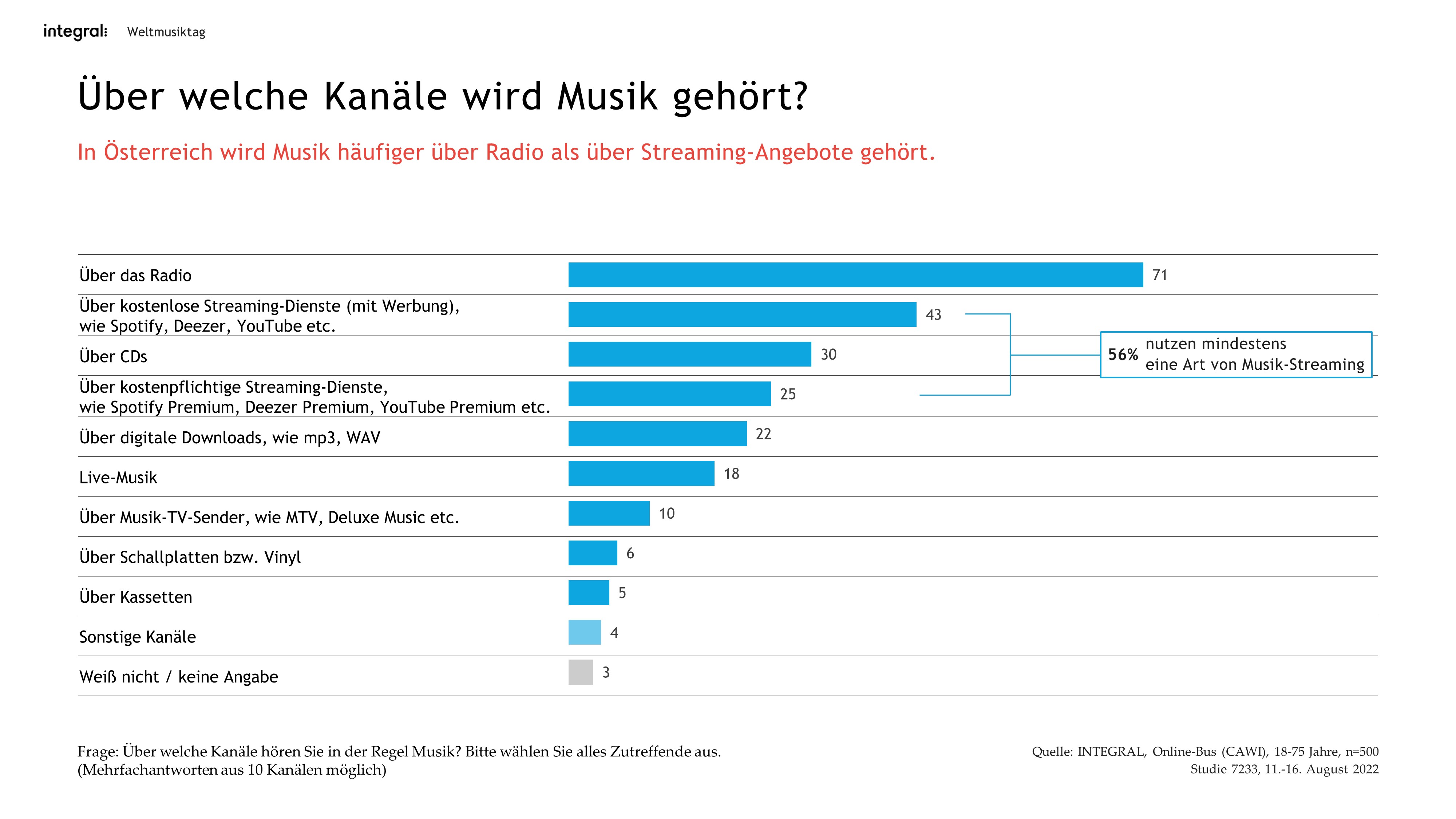 Musik ist allgegenwärtig. Ob als Hintergrundkulisse in Geschäften, als Begleitung auf Bahnfahrten oder während eines Live-Konzertes – für eine große Mehrheit der österreichischen Bevölkerung ist Musik wichtig im Leben. Ein Großteil der Befragten sagt außerdem, Musik verbinde Länder und Kulturen. Unter diesem Motto steht der Weltmusiktag am 1. Oktober. Eine INTEGRAL-Onlineumfrage widmet sich zu diesem Anlass verschiedenen Fragen rund um die Themen Musikkonsum, -gewohnheiten und -einstellungen.
