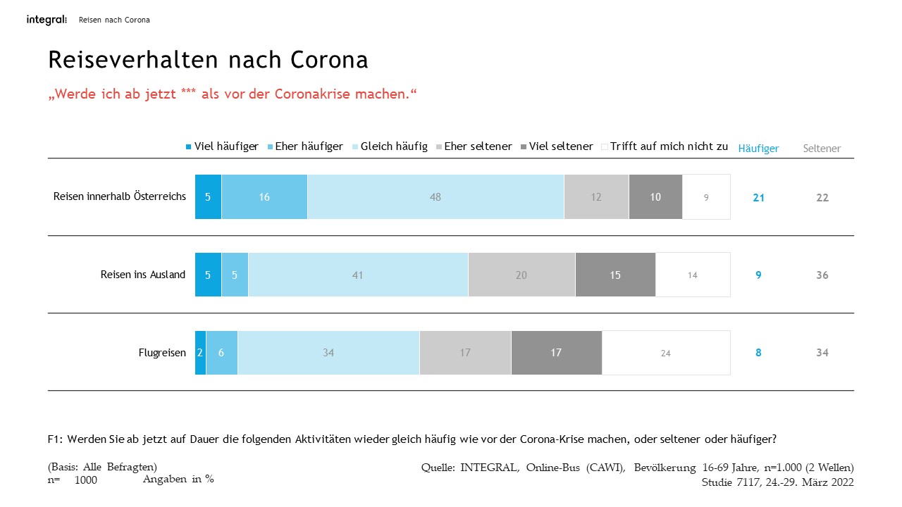 Ausgeglichen stellt sich die Bilanz der Inlandsreisen dar. 21% planen, häufiger Reisen innerhalb Österreichs zu unternehmen, 22% haben dies seltener vor. Praktisch die Hälfte der Befragten (48%) erwartet keine Veränderung.