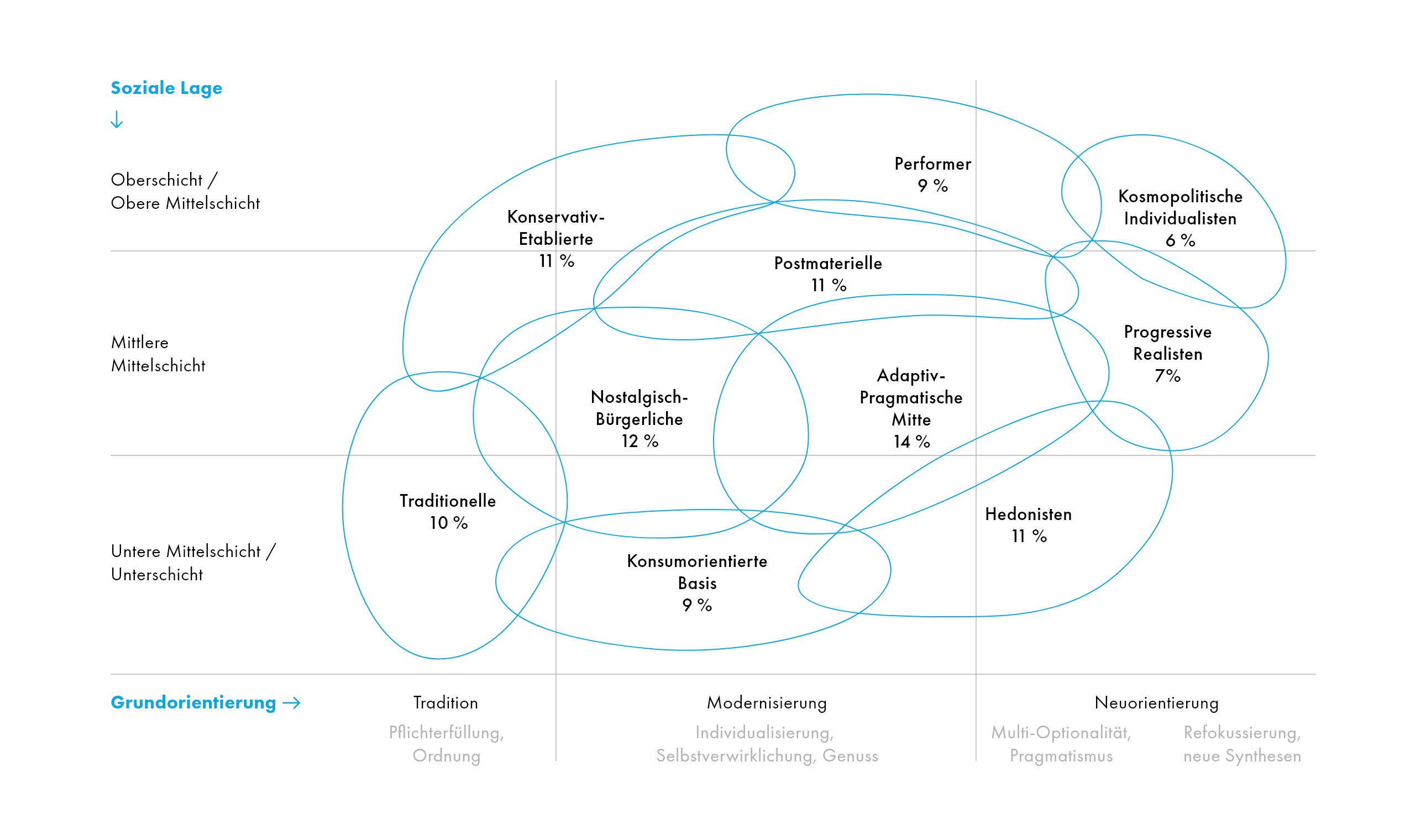 Für Studien, die in Deutschland und Österreich durchgeführt werden und bei denen Ländervergleiche gewünscht sind, empfehlen wir die Verwendung des internationalen Systems der Meta-Milieus.